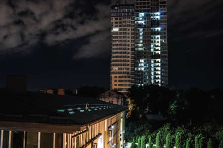 Modern office building at night. Night lights, city office building downtown, cityscape view