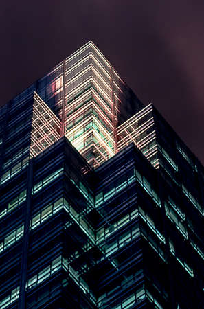 Close up view of Hong Kong landmark office building at night in Hong Kong