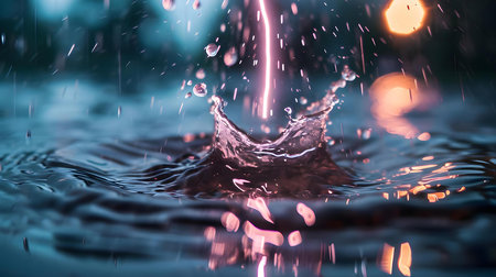 Close-up of a water splash illuminated by vibrant city lights in the background, capturing motion and energy in a night scene.
