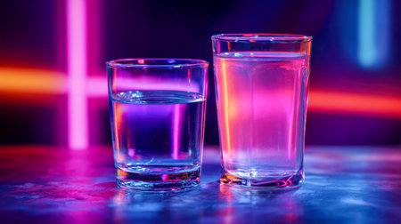 Two transparent cups cradle shimmering water that mirrors striking neon hues, set on a glossy surface, with a moody backdrop streaked in lively, colorful light trail