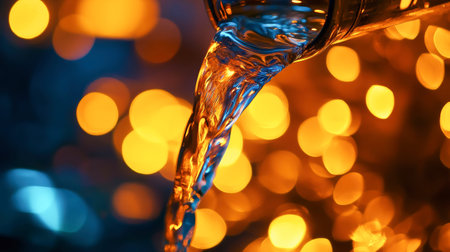 A captivating image showcasing golden liquid flowing gracefully against a dark backdrop, enhanced with sparkling bokeh lights, creating an enchanting ambiance.