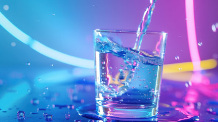 A captivating image of a splash of water in a clear glass, set against a vibrant neon background. Droplets glisten on the wet surface, capturing freshness.