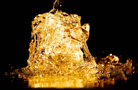 A golden-lit water splash, shimmering as it breaks the darkness of the background.