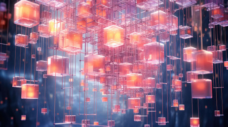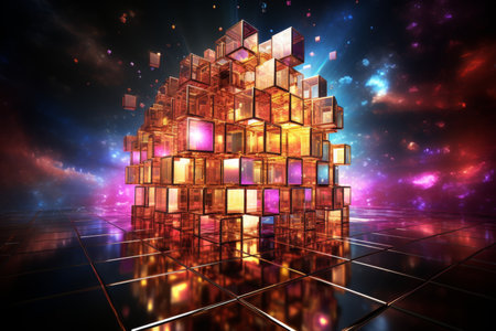 An artistic rendering of several translucent cubes floating in space, with vibrant colors and intricate details, creating a futuristic and abstract visual.