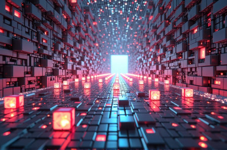 Futuristic tech tunnel with illuminated cubes in endless perspective. That the image is generated using AI.