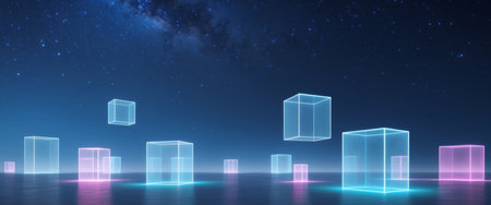Vibrant neon cubes floating in a futuristic digital environment at night