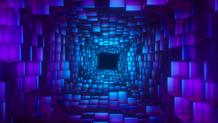 Abstract flying in futuristic corridor, fluorescent ultraviolet light, geometric endless tunnel, blue pink spectrum, 3d illustration. Wall of square blocks is moving