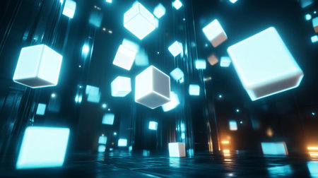 Vivid floating cubes of light illuminate a dark digital space, creating a mesmerizing atmosphere that evokes feelings of innovation and technology.
