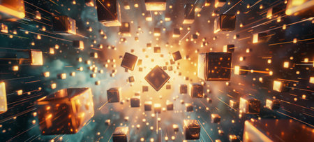 Glowing abstract cubes floating in a dynamic digital space, creating a futuristic technology concept