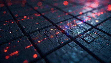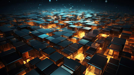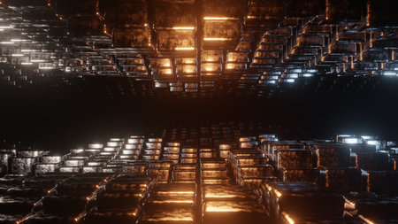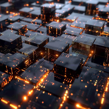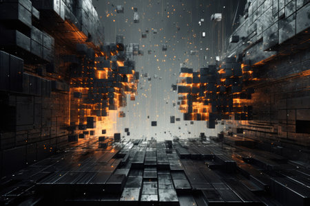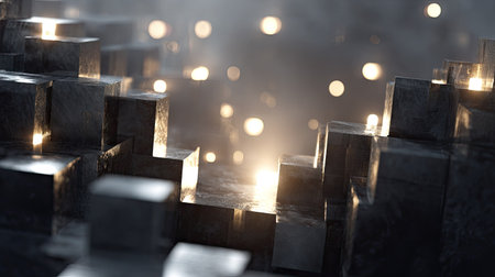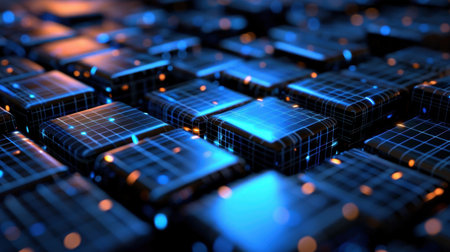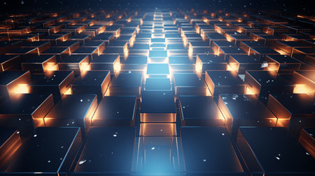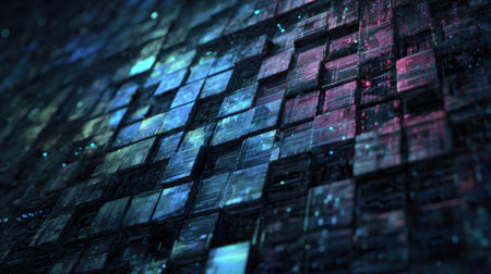 This striking abstract image features illuminated blocks arranged in a grid-like pattern, showcasing a blend of technology and modern design elements.