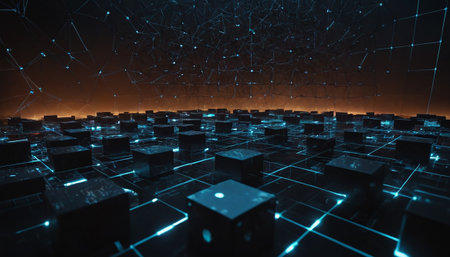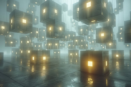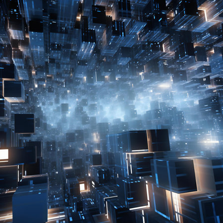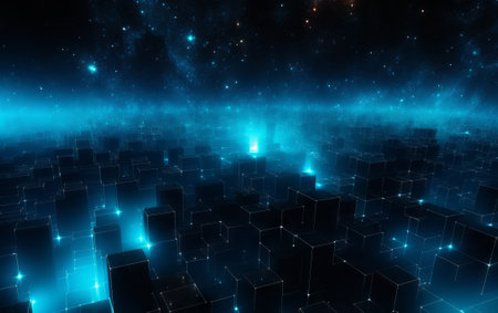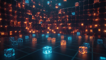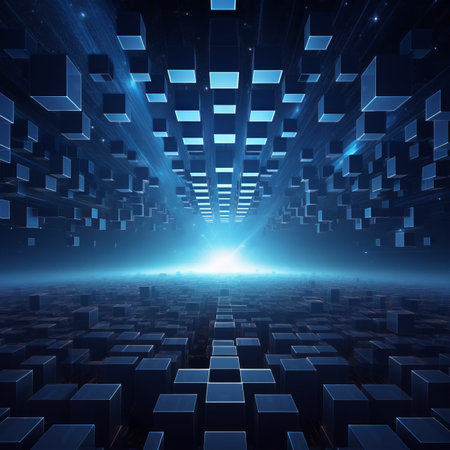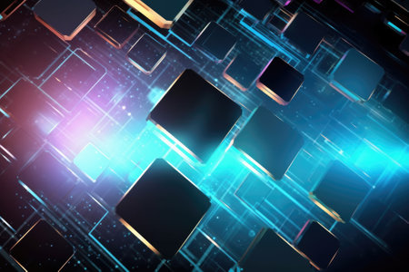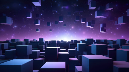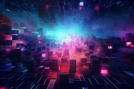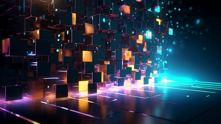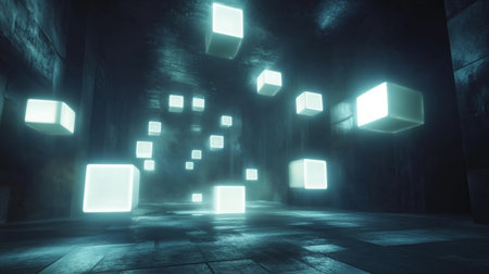 Vivid floating cubes of light illuminate a dark digital space, creating a mesmerizing atmosphere that evokes feelings of innovation and technology.