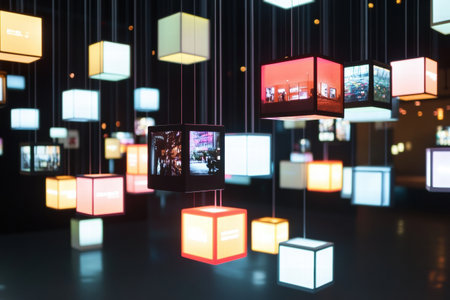 Illuminated floating cubes hang from the ceiling, each featuring abstract text and various multimedia symbols, creating a vibrant art installation.
