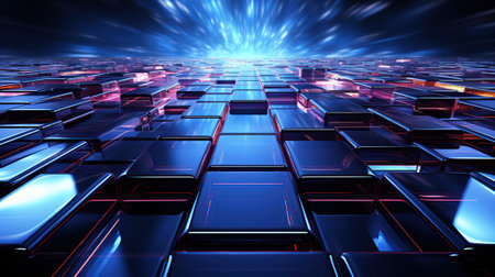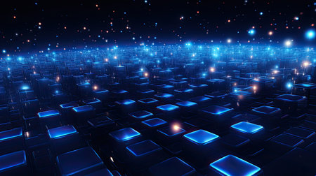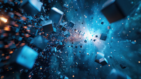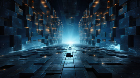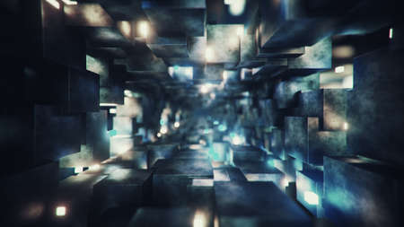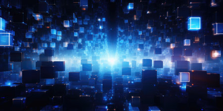 3D rendering of abstract digital technology concept with glowing cubes and blue lights