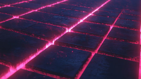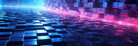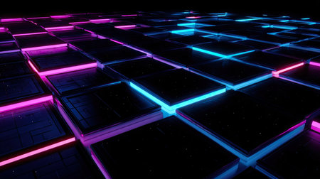 This image showcases a grid of dark squares illuminated by vibrant blue and pink neon light. The composition features a perspective view, highlighting the geometric pattern. The style is modern, with a focus on color and texture, suitable for various design projects and digital art applications.