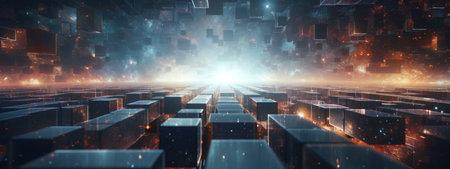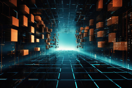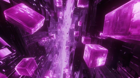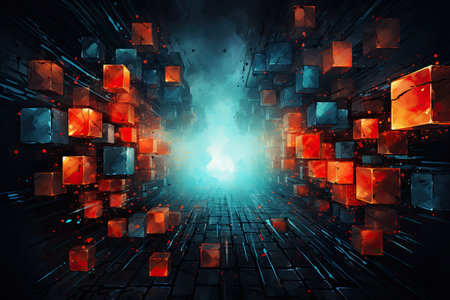 Abstract illustration of glowing data cubes flowing through cyber space with a futuristic feel