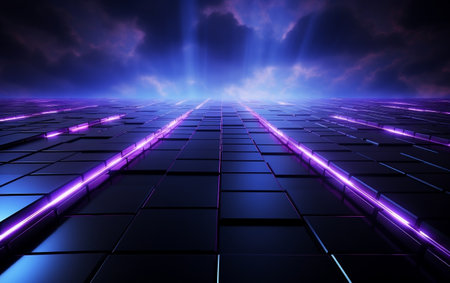 Futuristic glowing tiles in a digital landscape with blue light reflections creating an immersive technology-inspired environment for innovative designs