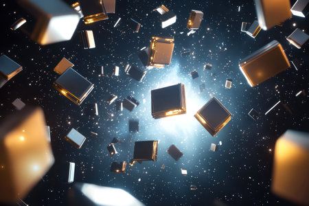 Glowing blue and gold cubes floating in the air with neon light, zero gravity polygons, creativity, festive, digital, blockchain, innovation concept, hi-tech abstract backgroud. Generative AI