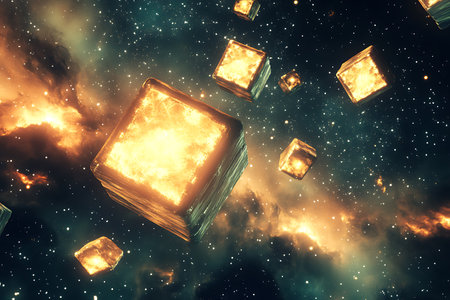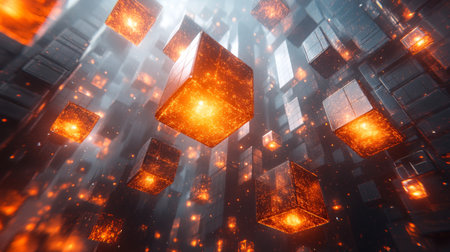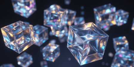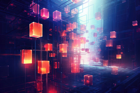 An artistic rendering of several translucent cubes floating in space, with vibrant colors and intricate details, creating a futuristic and abstract visual.