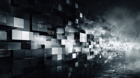 This image depicts an abstract composition of digital cubes floating amidst a smoky environment. The artwork features a grayscale palette with varying shades, emphasizing depth and texture. The scattered cubes suggest dynamic movement and are suitable for graphic design, website backgrounds, and creative projects. The overall design implies technological innovation and futuristic aesthetics.