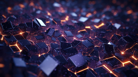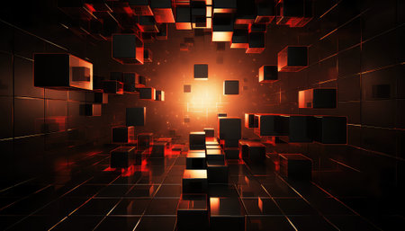 Floating fiery cubes illuminate a digital landscape in a darkened space filled with abstract geometric shapes. Generative AI