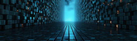 A seemingly infinite hallway lined with glowing blue cube patterns, creating a mesmerizing sci-fi banner background