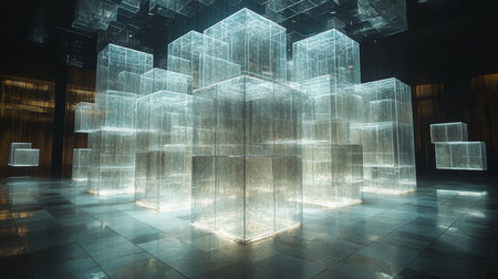 A captivating display of illuminated translucent cubes in a darkened gallery space creating an ethereal ambiance. Generative AI