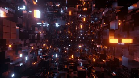 Abstract 3d rendering of cubes with glowing lights. Futuristic background.