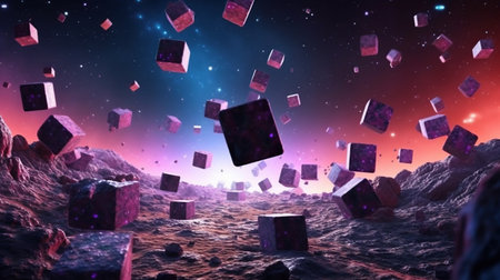 This captivating digital artwork features floating pink cubes within a dark space, creating a mesmerizing combination of colors and depth, perfect for modern use.