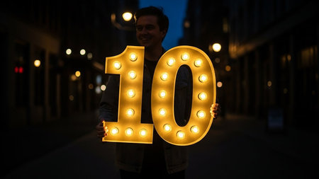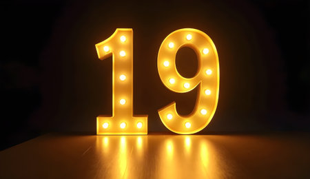 Golden number 19 with embedded warm LED lights glowing beautifully against black backdrop