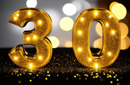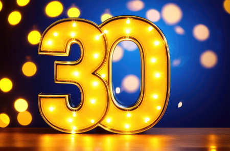 3d glowing number thirty on dark festive background with bokeh. birthday celebration.