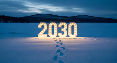Large, illuminated numbers spelling out 2030 are positioned in a wide, snow-covered expanse, likely a frozen lake. Footprints are visible leading up to the glowing digits. The sky is dark and cloudy, typical of twilight or dusk, with dark, forested hills in the background. The bright light from the numbers creates a focal point against the muted winter scenery.
