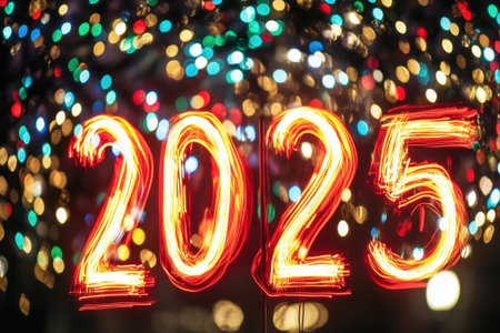 Vibrant lights illuminate the numbers for 2025 creating a festive atmosphere for New Year celebrations.