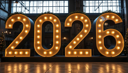 Illuminated 2026 numbers recreating a marquee light sign, representing new year, future, and celebration