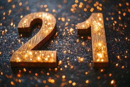 Glittering lights surround a wooden cutout of the number 21 on a dark, textured surface, creating a festive atmosphere. perfect for new year celebrations, milestone events, and holiday decor. Generative AI