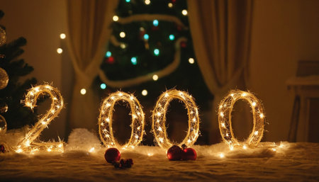 Illuminated 2025 in glowing golden light garland for holiday celebrations