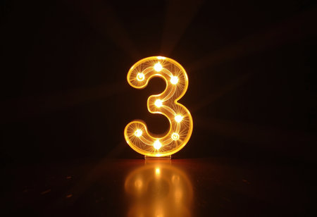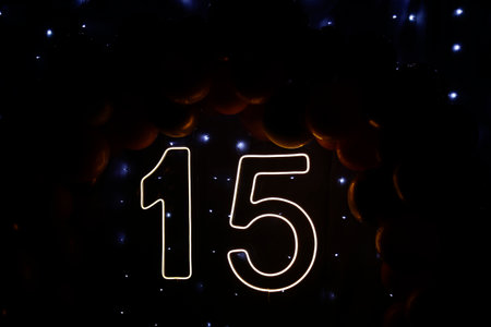 Number fifteen with lights on and clear - fifteen years - fifteen illuminated - large and clear number against dark background