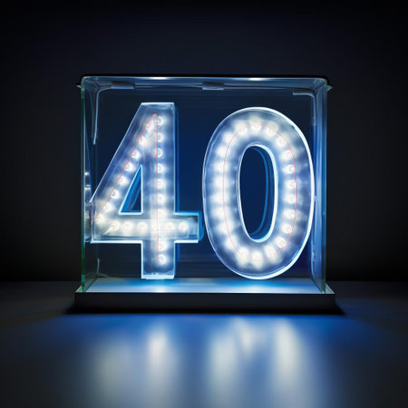 a box with neon lights displaying a number, featuring a realistic and detailed rendering reminiscent of 20th-century art. the image showcases lens flares, indicating a vibrant and dynamic composition. this captivating artwork, a contest winner, highlights the use of glass as a material, with a striking combination of light red and azure colors. the realistic usage of light and color adds depth and visual appeal