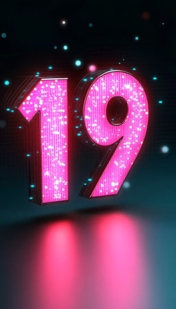 Glowing Digital 3D Number 19 In Futuristic Style on a Dark Background With Abstract Lights