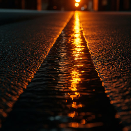 A unique perspective of a glowing yellow line on a city street at dusk, surrounded by colorful bokeh lights, creating a serene and captivating atmosphere.