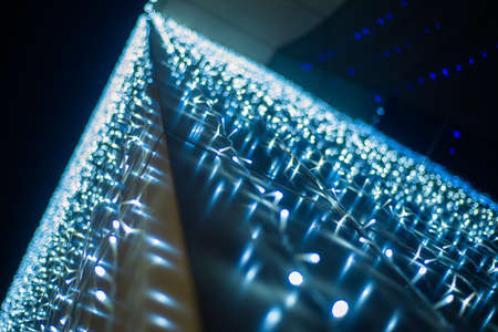 Fairy lights background - close up of blue and white garland lights with bokeh effect