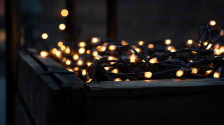 A stunning close-up of twinkling lights nestled in a rustic wooden box, creating a warm and inviting ambiance perfect for festive occasions and cozy evenings.