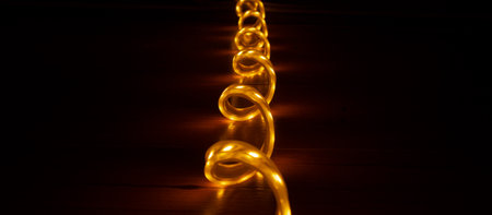glowing strip of LED decorative lighting in warm yellow color on a dark background.