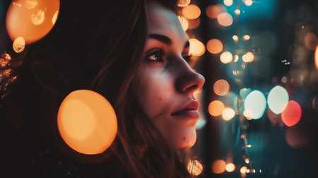 Portrait of beautiful young woman with bokeh lights on background.