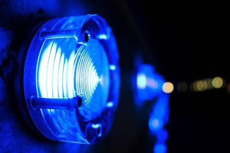 Round blue lamp, on dark background. closeup.