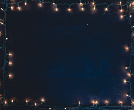 Christmas Warm Light on Natural Background Top View with Copyspace. Beautiful Garland Lights Texture or New Year Pattern for Xmas Design