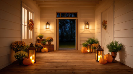A charming autumn porch setting featuring pumpkins, glowing lanterns, and vibrant mums, creating a warm and inviting atmosphere perfect for seasonal gatherings.