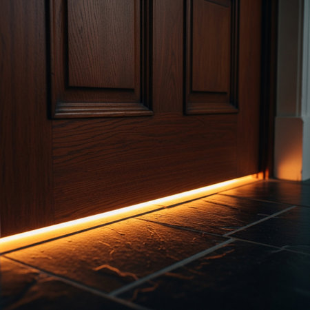 A long, dark corridor is highlighted by linear LED lighting along the floor, leading to a warmly lit doorway at the end. The interior features smooth, dark walls and reflective flooring. The overall aesthetic suggests a contemporary, minimalist design, suitable for various commercial or editorial applications.