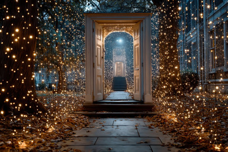 This captivating image features an illuminated pathway adorned with numerous twinkling lights, creating a magical atmosphere perfect for events.