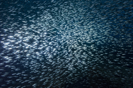 Massive school of sardines in a shallow reef. Sardine shoal or sardine run in Moalboal is a famous tourist destination in the southern town of Cebu, Philippines.