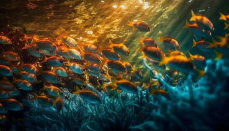A vibrant underwater scene showcasing a large school of fish swimming above a coral reef, bathed in golden sunlight.